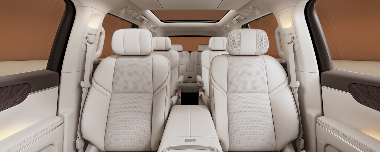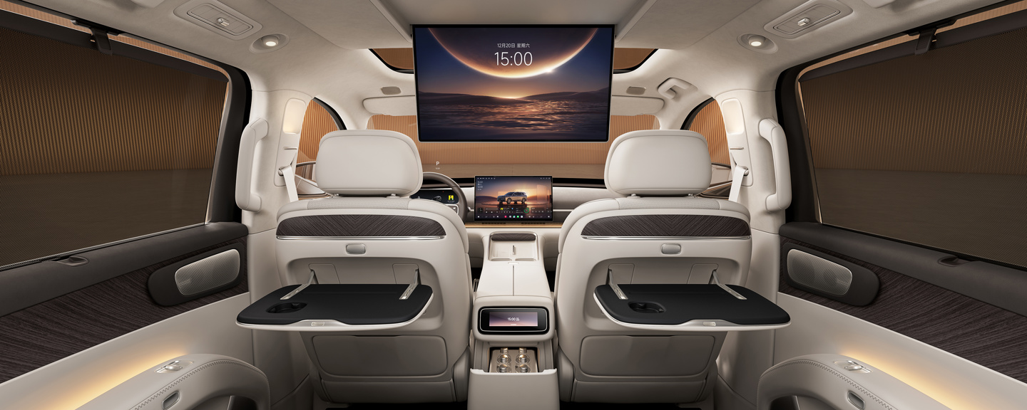 座椅配置方面,前排标配电动调节、加热、通风、按摩、记忆及方向盘加热功能。6 座版第二排配备零重力座椅,支持 120 度零压躺姿及 4 向腿托调节,中央过道宽度 195mm,右侧座椅支持电动横滑功能。7 座版第二排座椅椅背最大可调至 145 度,支持一键折叠。两种版本第二排均标配加热、通风、按摩及记忆功能。第三排座椅支持电动调节,椅背最大角度 131 度,具备一键折叠、加热及记忆功能。此外,第二、三排均标配电动遮阳帘。后排还配备小桌板、8.1L 冷暖箱(支持-6°C 至 50°C 宽温域调节)、全景天幕及双层隔音玻璃等配置。