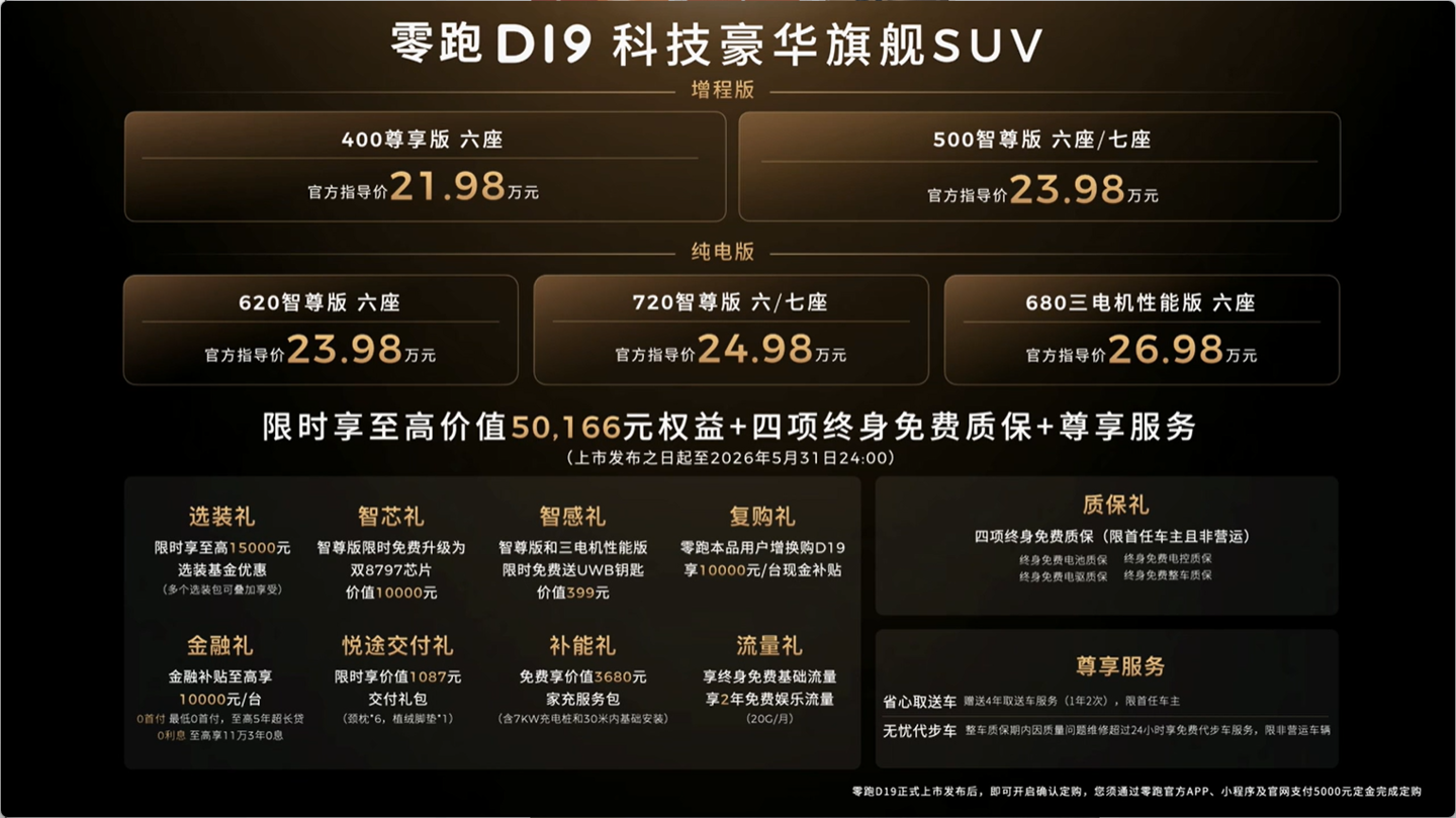 IT之家 4 月 16 日消息,今日零跑汽车旗下 D 系列首款车型 —— 零跑 D19 正式上市并开启交付,新车共推出 7 款配置车型,官方指导价格区间为 21.98-26.98 万元。作为品牌旗舰级产品,D19 基于 LEAP 4.0 技术架构打造,定位大型 SUV,提供 6 座与 7 座两种空间布局。